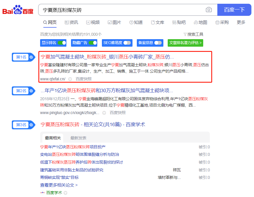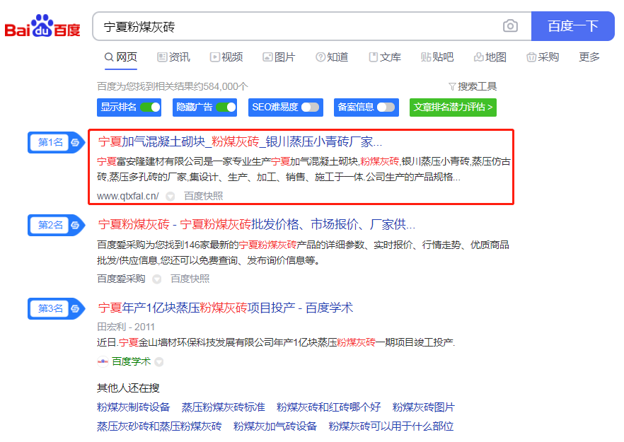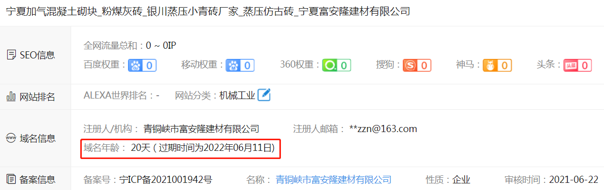 富安隆建材網站上線后,僅用了10天的時間,就被百度收錄,關鍵詞:寧夏蒸壓粉煤灰磚、寧夏粉煤灰磚、寧夏蒸壓仿古磚均占據首頁*名。此外,富安隆建材網站的到訪率和詢盤量正在持續上升中,相信很快就能迎來成交。